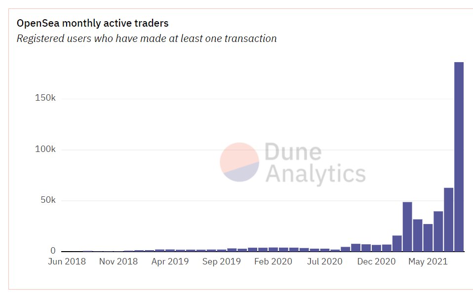People often ask if this is a bubble that has reached (or is close to) the top. I obviously wouldn’t be dedicated so much of my time and career to the space if I thought it was, but one helpful thing for me was looking at the above data. As of August, 2021, there are only roughly 200,000 monthly active wallets on Opensea, which is BY FAR the largest NFT trading platform that currently exists. At the same time, Coinbase reported having 6.1 million active users in the first quarter of 2021 and MetaMask reported having 10 million active users in August of 2021.